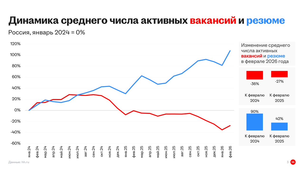 Это подтверждает статистика hh.ru. Среднее значение hh.индекса (соотношение резюме на вакансию) в 2025 году составляло 6 резюме на вакансию — это считается оптимальным уровнем. Однако в течение года показатель заметно вырос: с 4,8 в начале года до 8 к концу. В начале 2026 года тренд только усилился: в январе и феврале hh.индекс достиг 9,6 и 9,8 соответственно.